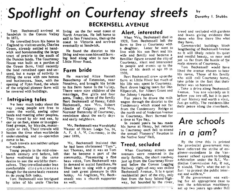 Local historian Dorothy Isabelle Stubbs (1905-2003) wrote several different columns for newspapers over the years including “Spotlight on Courtenay Streets” for the Comox District Free Press in 1970.