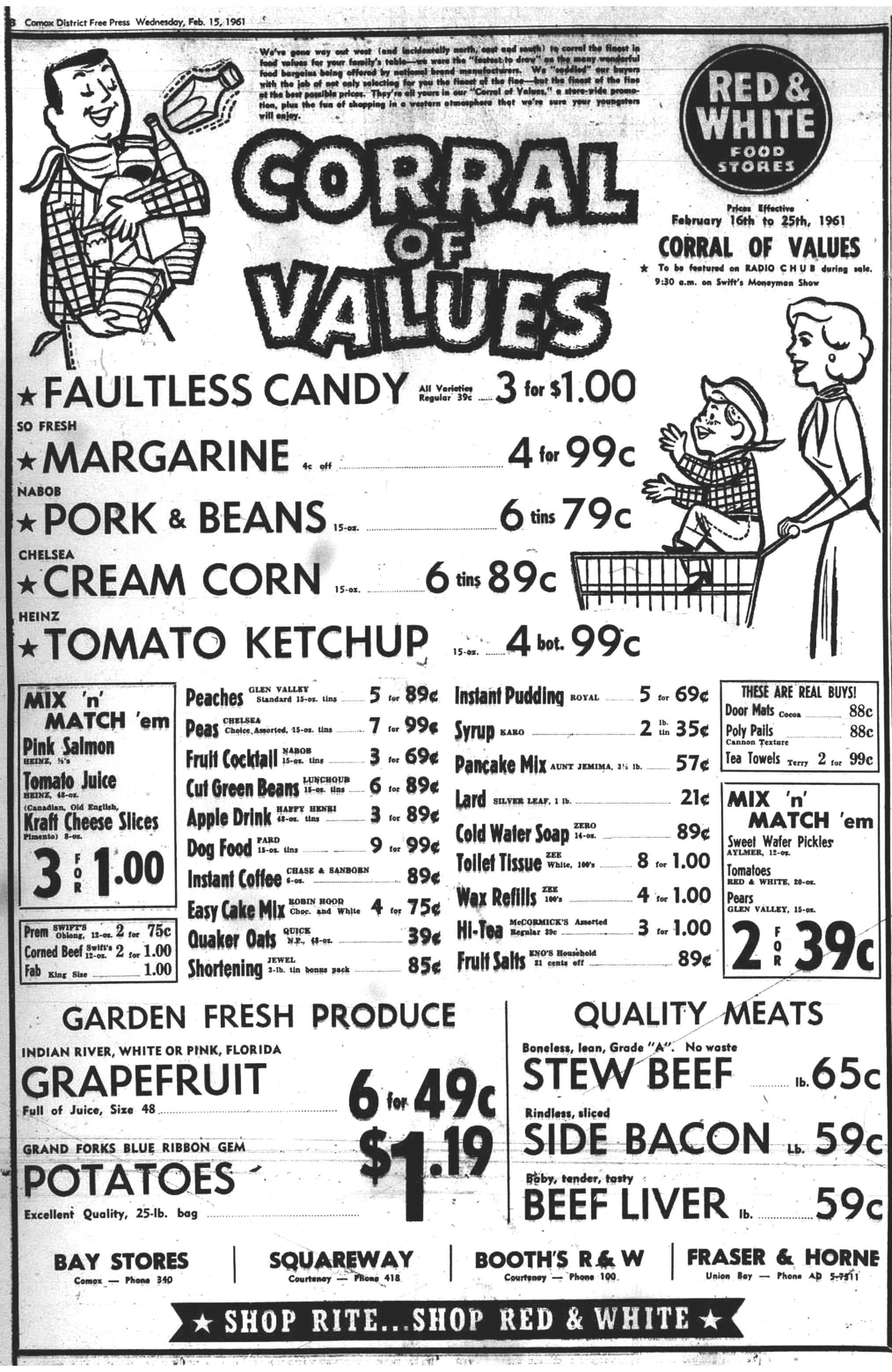 The full page announcement is advertising four local shops that were all under the Red & White Store banner. The Red & White Stores were independently owned in the days before the big supermarket chains.