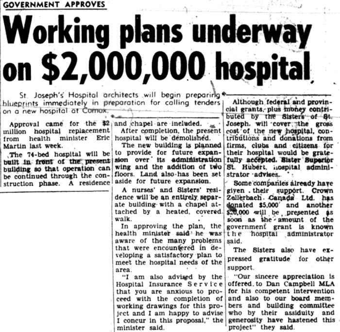 According to the Comox District Free Press July 7, 1993 St. Joseph's General Hospital Commemorative Edition "...the project began with controversy in 1965 when municipal officials and the Sisters could not come to terms over who would pay for the expansion. A deal was eventually struck and St. Joseph's became Comox's regional hospital." The building was officially opened June 14, 1967.