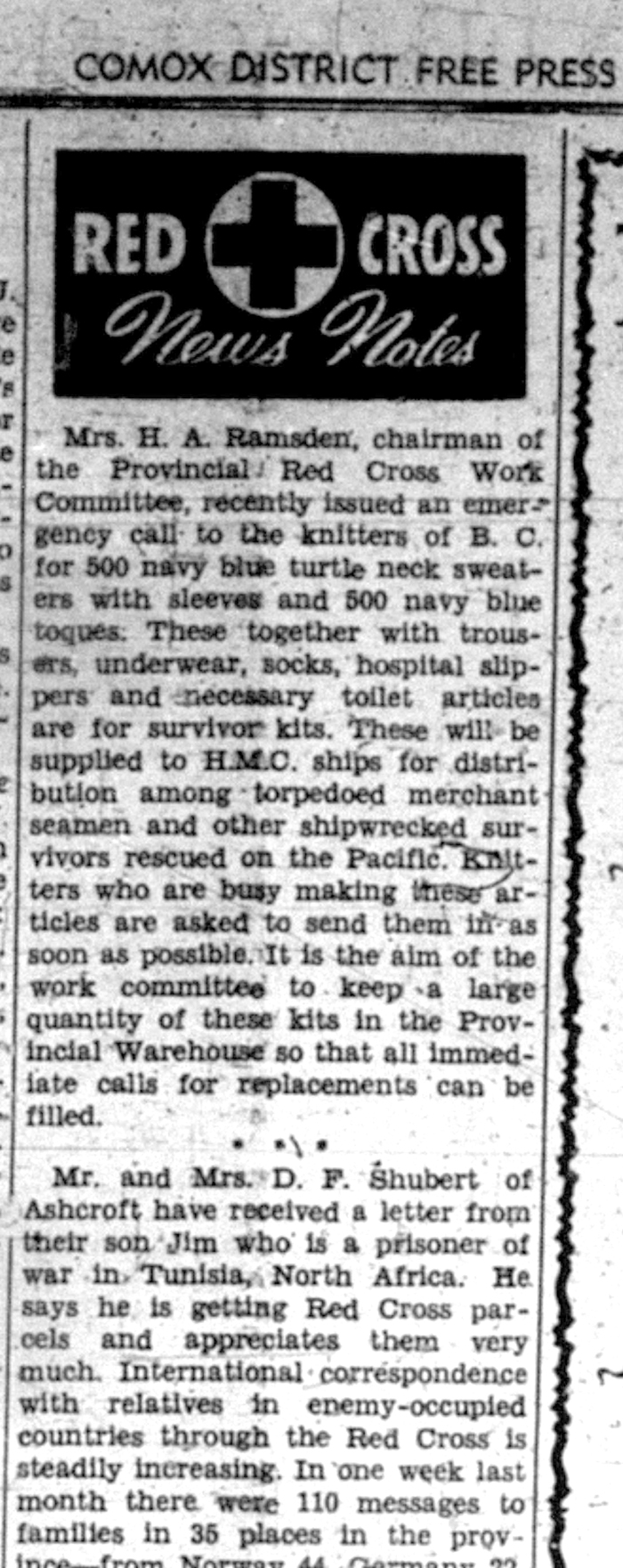 Many of the people "back home" during World War II wanted to do something to help the war effort, the women were no exception. In this August 20, 1942 Comox District Free Press article the Red Cross is issuing an emergency call out to the knitters of B.C.