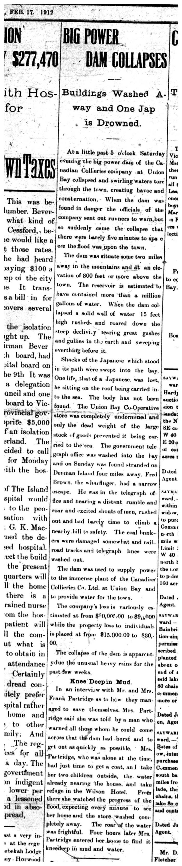 To commemorate the topic we include this photograph of the damage to Union Bay when the power dam (Washer Creek Dam) collapsed on Saturday, February 10, 1912. You can also read the original newspaper article from the February 17th edition of The Islander.