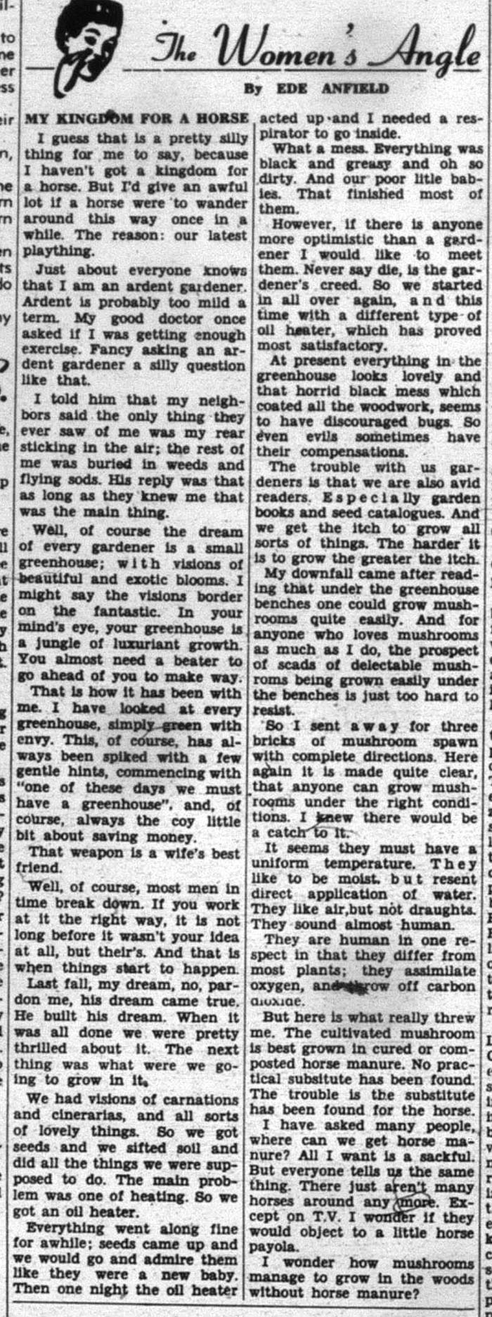 Columnist Ede Anfield touched on those same ideas in "The Women's Angle" article that appeared in the March 16, 1960 edition of the Comox District Free Press.