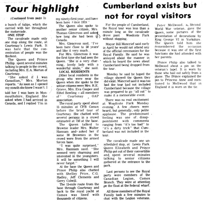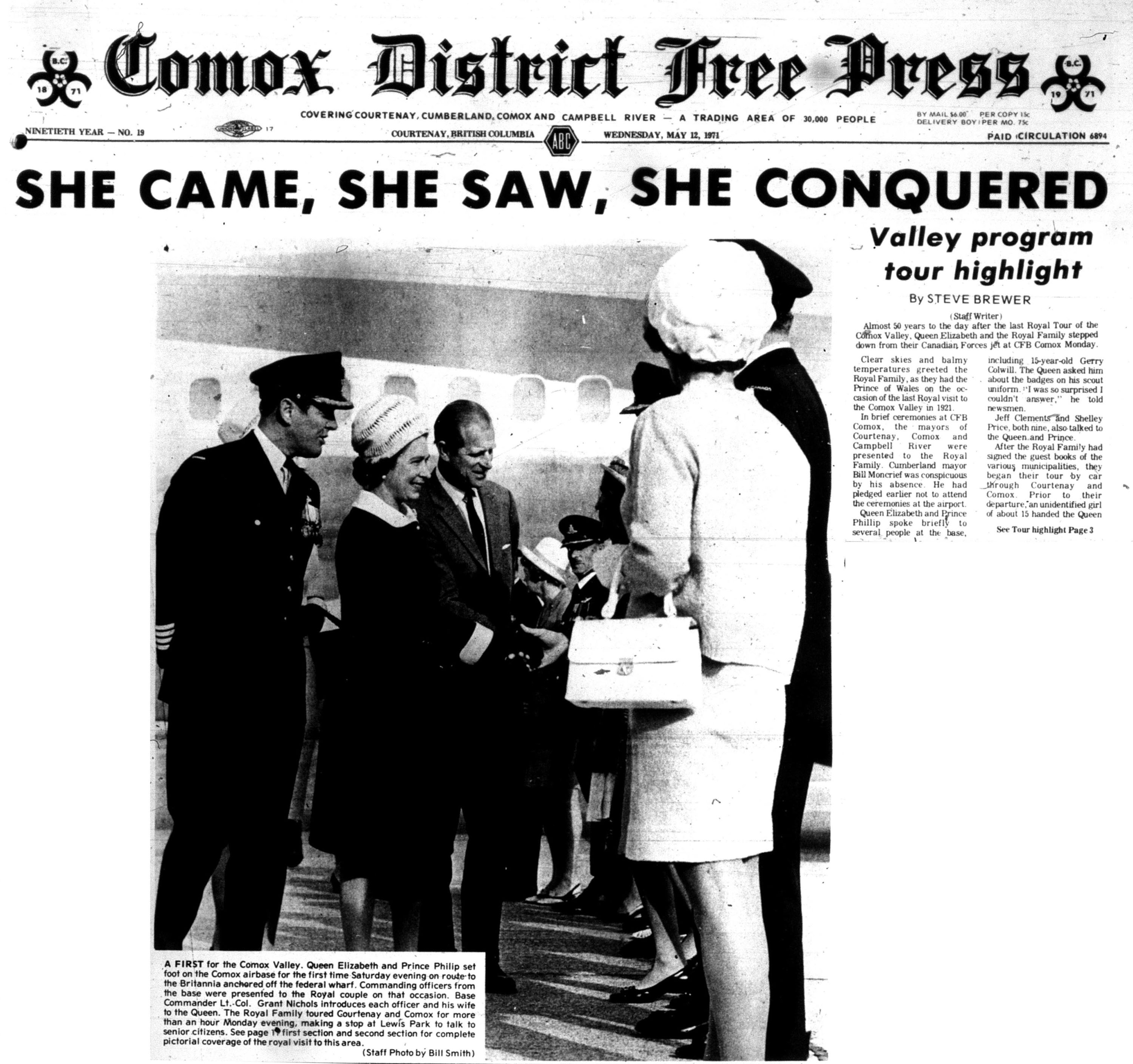 It's All There in Black and White The Comox Valley was visited by Queen Elizabeth II and members of the Royal Family in 1971. But no Royal visit would be complete without some controversy! Have a look through this article from the May 12th edition of the Comox District Free Press to find out more. Click for a Larger Image