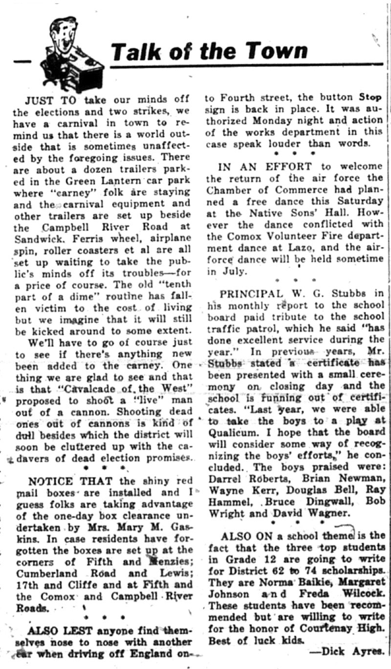This year is the Diamond Jubilee marking 60 years of Queen Elizabeth II's ascension to the throne. What was on the minds of ordinary folks here in the Comox Valley at this time of change? To get a glimpse, read this newspaper article "Talk of the Town" from the June 19, 1952 Comox District Free Press. The article is written by Dick Ayres - a practitioner of the tongue-in-cheek humour style.