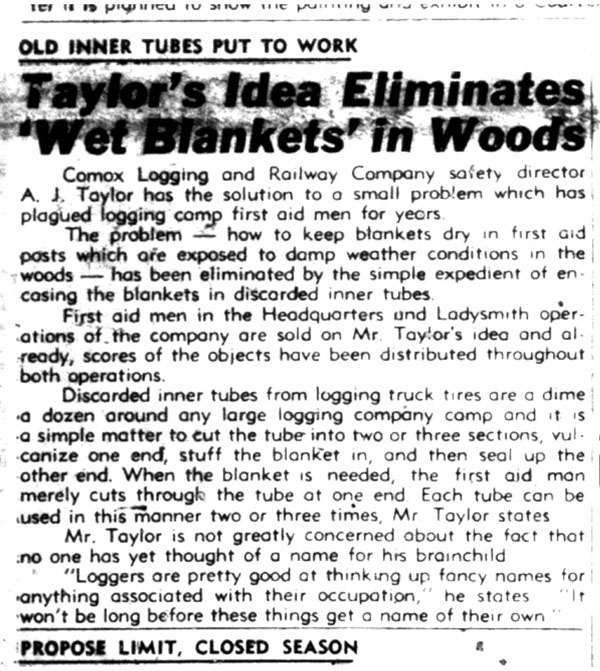Have a read through this article from the Comox District Free Press of November 10, 1949 to discover a clever example of “reduce, reuse, recycle”.