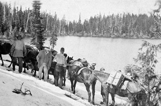 Fishing party, ca. 1920s. Many lines are in the river but no fish were caught according to a note on the back of this photograph. Jennie Childs and Audrey Grieve are the two women in the image. A man identified as Mr. Gould stands slightly apart with his back to the camera.
