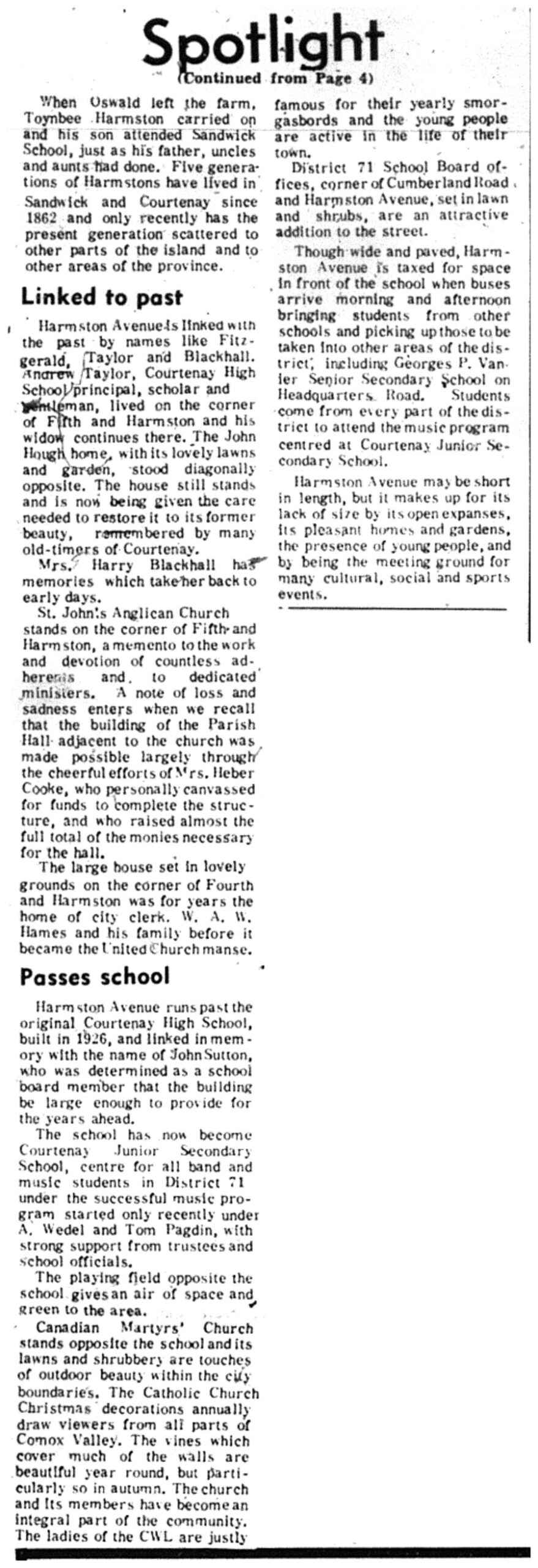 The article was penned by local historian Dorothy Isabelle Stubbs (1905-2003) who wrote several different columns for newspapers over the years including “Spotlight on Courtenay Streets” for the Comox District Free Press in 1970. This article appeared in the April 1st edition.