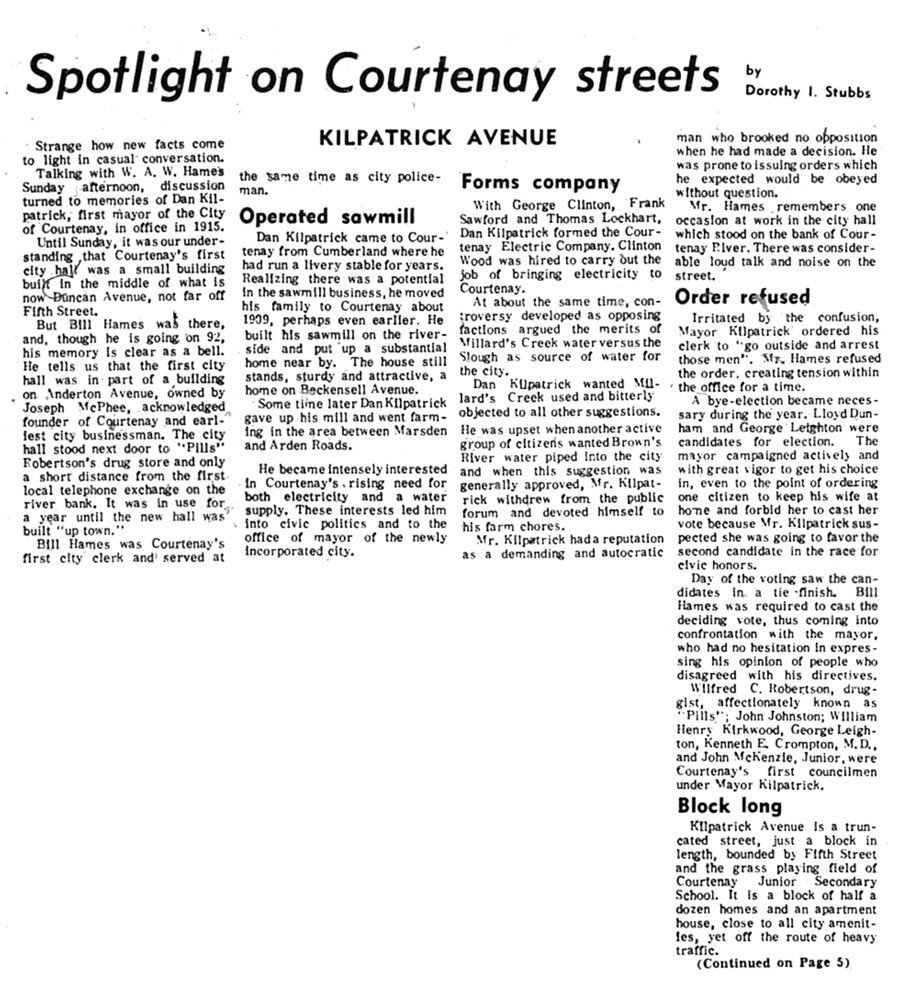 This month Kilpatrick Avenue is in the limelight with tales of early civic politics, rivalries and good works all wrapped up in an article from the Comox District Free Press of April 15, 1970.