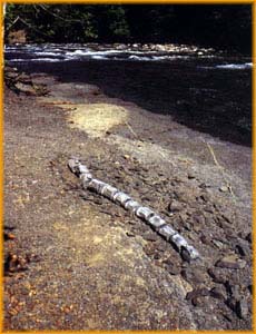 the shale chips away. By the end of the afternoon they had uncovered twelve large bones lying next to each other in a row. It was certainly part of the spine of a large animal. |