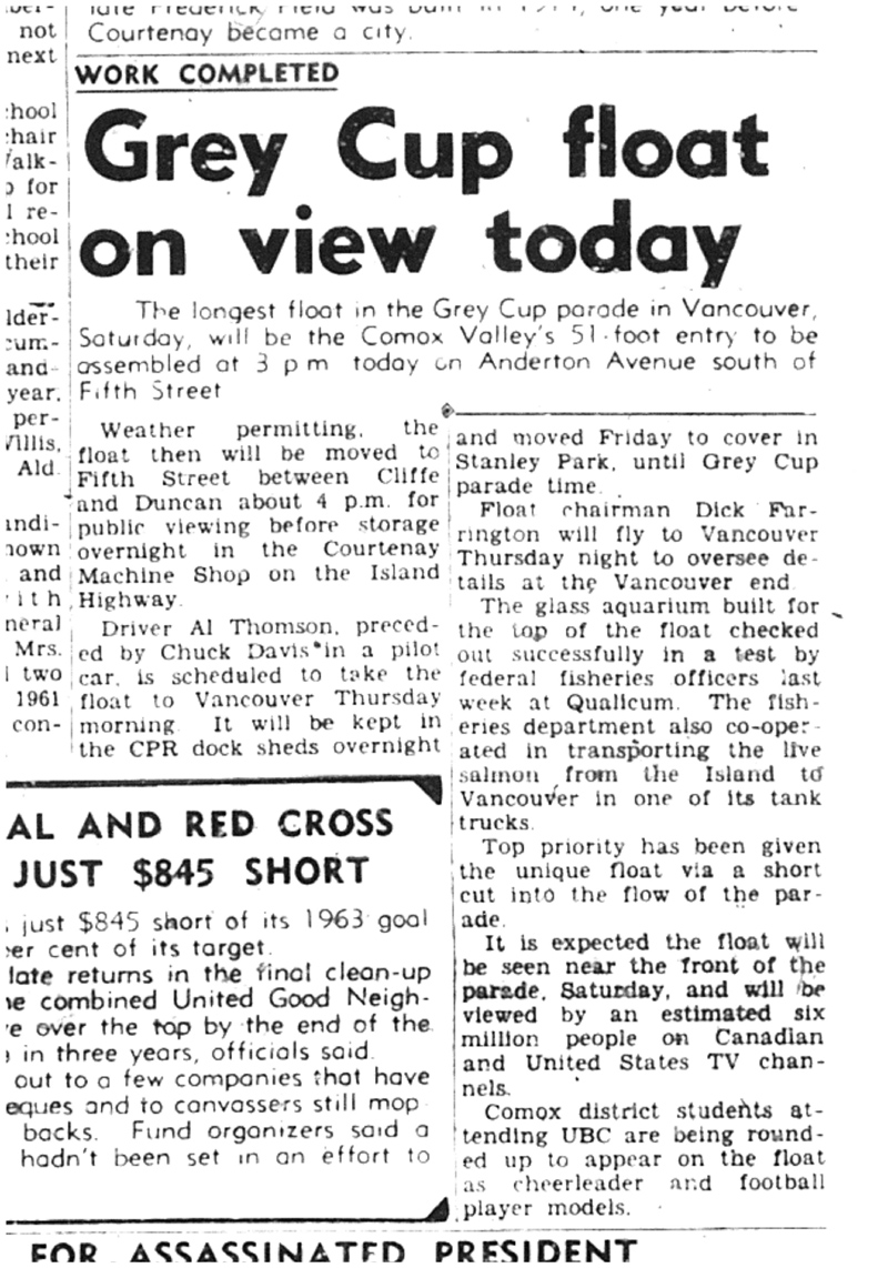 Grey Cup coming up! Courtenay entered a float in the 1963 Vancouver Grey Cup parade. Our float was described as the biggest in the procession and was truly a community effort to produce. All in the name of showing support for the BC Lions who held training camps here (on and off) starting in 1961. Check out this article from the Comox District Free Press of November 27, 1963.