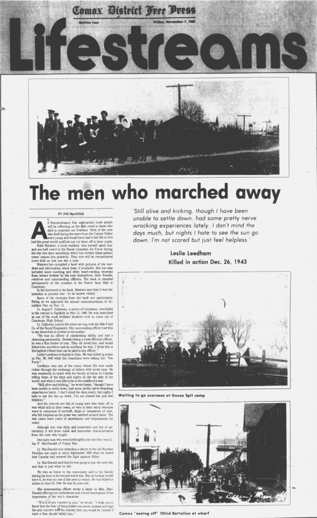 This November 7th, 1980 Comox District Free Press article speaks to us of the sacrifices made by the young men from our community and the woman who was not willing to let us forget. Though the Courtenay and District Museum has moved from the Native Sons Hall to the former Post Office, Ruth Masters book “Lest We Forget” is still on display to honour these men.