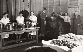 Comox District Women’s Institute making Red Cross Jam, 1941. Left to right: Effie Clowes, Evelyn Harmston, Maggie McPhee, G.W. Stubbs, Leo Anderton, Theed Pearse, Berkeley Grieve, A.H. Davidson.