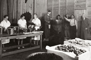 Comox District Women’s Institute making Red Cross Jam, 1941. Left to right: Effie Clowes, Evelyn Harmston, Maggie McPhee, G.W. Stubbs, Leo Anderton, Theed Pearse, Berkeley Grieve, A.H. Davidson.