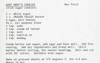 Sugar cookies with a past? According to the cookbook, Favorite Recipes, this one can be traced back to Jane Piercy (nee Speedy, b. 1846 – d. 1939). The recipe book was created in honour of the 60th Anniversary of the Canadian Daughters League of Courtenay in 1984.