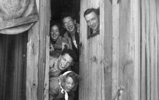 Here now is an image from the museum’s newest award-winning book Step into Wilderness – A Pictorial History of Outdoor Exploration in and around the Comox Valley. Photo credit: Weekends on Forbidden Plateau were social and high-spirited. Top from left: Sheelagh Corfield, Jerry Macdonald and Jack Hough. Below: Roy Macdonald and Doreen Pope. Photo: 993.39.13. Page 207.