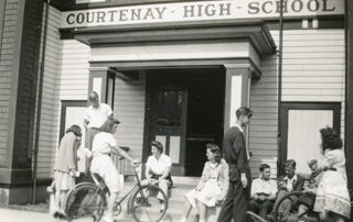 As many children and young adults make their return to class this September, the museum would like to shine a light on this photo of students socializing outside the front steps of Courtenay High School in 1943. Photographer: Rod McIntyre.