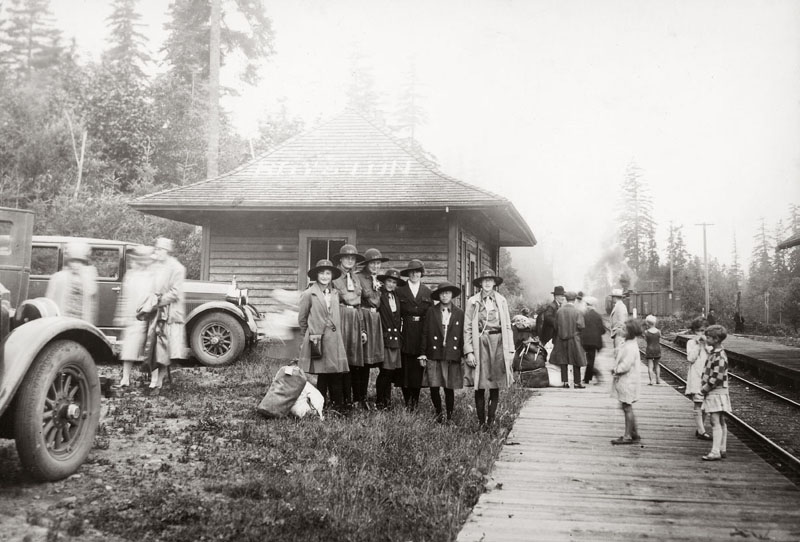 Photo caption: “The first E & N passenger train arrived in Courtenay on August 6, 1914. The August 13 Courtenay Review noted that the train “consisted of baggage and express cars and four coaches.” The trip from Victoria covered 139.7 miles, with the train averaging a speed of roughly twenty miles an hour.