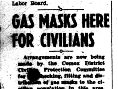 Some of the text in this article from the Comox District Free Press of November 19, 1942 might be a bit difficult to make out. To clarify the issue, here's what the Comox Argus had to say: "The ARP has received two tons of gas respirators for the use of the civilian population. The two tons represent 2790 masks. These masks will be sold to the public for $1.25 each and ARP instructors will be available to show the applicants how to wear them."