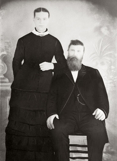 Photo caption: "Ten years after his 1862 voyage, in April 1872, Sam Cliffe married Florence Harmston, who had made the same voyage on the Silistria at the age of six with her parents, William and Mary Harmston. According to family stories, the Harmstons had intended to continue their voyage on the Silistria to arrive in April in Port Clemens, New Zealand. They changed course when they noticed an ad for prairie land in the Comox Valley. Florence, born on the Isle of Man, had fifteen children with Sam. Ten survived to adulthood. Florence and Sam took over the Lorne Hotel in 1883. Sam died in 1908, and Florence twenty-one years later, in 1929." Page 14.