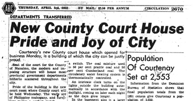 Courtenay's Court House officially opened on Monday, March 31, 1952. The building housed provincial government departments as well as the RCMP. This article from the April 3, 1952 Comox District Free Press gives all the details right down to the coal mixture used for heating (that's 50% Cumberland coal, in case you were wondering).