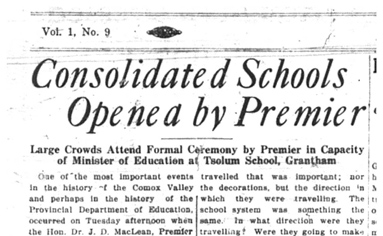 A brush with "celebrity" for Valleyites in September of 1927 when Premier J.D. MacLean officially opened the new consolidated schools. The article from the September 8th edition of the Courtenay Free Press goes on to list some interesting statistics about the growth of education in BC.