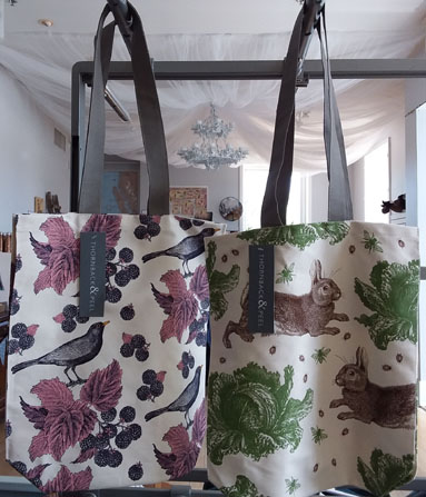 Check out these new totes made by Thornback & Peel Co. of the UK. The totes are made from strong canvas and have a good size gusset that expands to create a large carrying capacity. A perfect bag for grocery shopping! We have two very attractive prints: Rabbit & Cabbage and Blackbird & Bramble. These totes are a great gift idea and retail for $14.95 each plus tax.