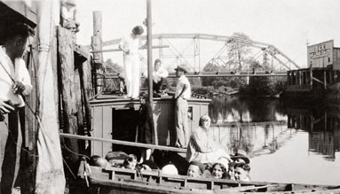 Photo credit: Boating party on the Courtenay River, ca. 1924. The girl at the front of photo in the white hat is Kathleen Stephens. Photo: CDM Stubbs Collection.
