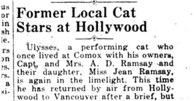 A multi-talented feline made good south of the border. The Comox District Free Press of September 9, 1937 carried the story of his lucky break on the front page.