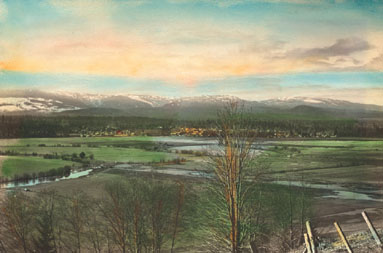 Photo credit: Postcard showing the view over the Dyke Flats towards Courtenay, after 1926. The photo was likely hand-tinted by Spalding’s wife, Ida Merle Spalding. Joseph Frederick Spalding photograph. Photo: 999.154.2.
