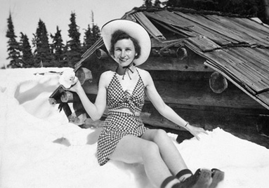 Sunbathing in hiking boots, Marjorie Biscoe strikes a pose beside the Mount Becher Cabin still buried in snow in June 1948. Photo from Step into Wilderness page 101, CDM Capes Collection.