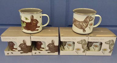 The very popular enamel mugs pictured above are made by Thornback and Peel, a company known for quality products. These unbreakable mugs feature fun designs and retail for $11.95 each.