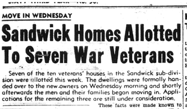 Known locally as the Duncan and Dingwall Veterans' Subdivision at Sandwick, the plan was announced in December of 1945 with houses allotted one full year later as seen in this article from the December 12, 1946 Comox District Free Press.