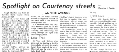 This month’s article is a tribute to the man known as the father of Courtenay, Joseph McPhee, the namesake of McPhee Avenue. Local historian Dorothy Isabelle Stubbs (1905-2003) wrote columns for different newspapers over the years including this one from the May 6th, 1970 edition of the Comox District Free Press.