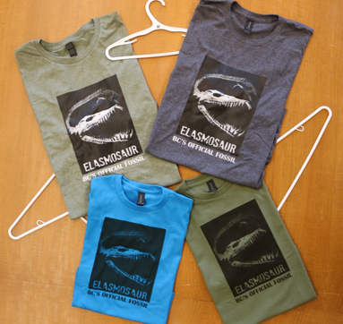 The Museum Gift Shop is happy to announce brand new colours of our popular elasmosaur t-shirts. We teamed up with our long-time collaborators at Hitec Screen Printing to locally print these fabulous shirts, available in heather green or heather navy in adult sizes ($35.99), and turquoise or olive green in youth sizes ($25.99).