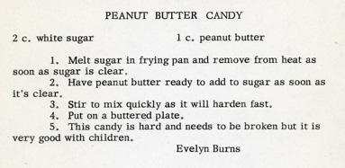 For those who want a twist on classic holiday fare, try a taste of Boiled Fruit Cake from Mrs. N.M. Pimlott. And for those cooks who like a pared down shopping list, why not a 2 ingredient Peanut Butter Candy from Evelyn Burns. Enjoy!