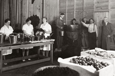 Comox District Women’s Institute making Red Cross Jam, 1941. Left to right: Effie Clowes, Evelyn Harmston, Maggie McPhee, G.W. Stubbs, Leo Anderton, Theed Pearse, Berkeley Grieve, A.H. Davidson.