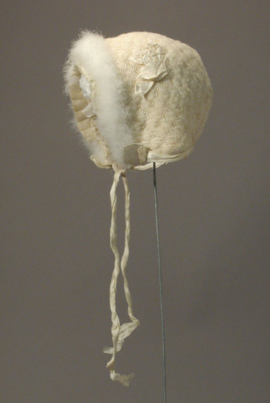 Here's a charming little baby bonnet from the museum's collection. Probably from about 1910-1920, this bonnet is trimmed with angora - both cute and cozy for baby.