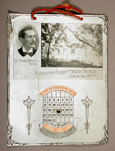 This charming artifact is a perpetual calendar affixed to a thin sheet of decorated metal. It may have been a token gift from Rev. Menzies to his congregation.