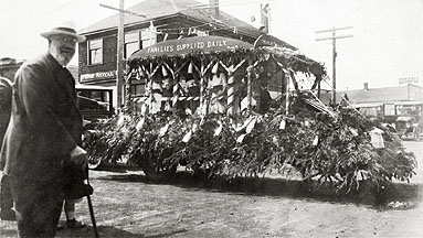 Photo caption: The lavish Comox Co-operative Creamery float passes by in the 1923 Courtenay May Day parade, while dairy producer Alex Urquhart watches from the sidelines. Page 90.